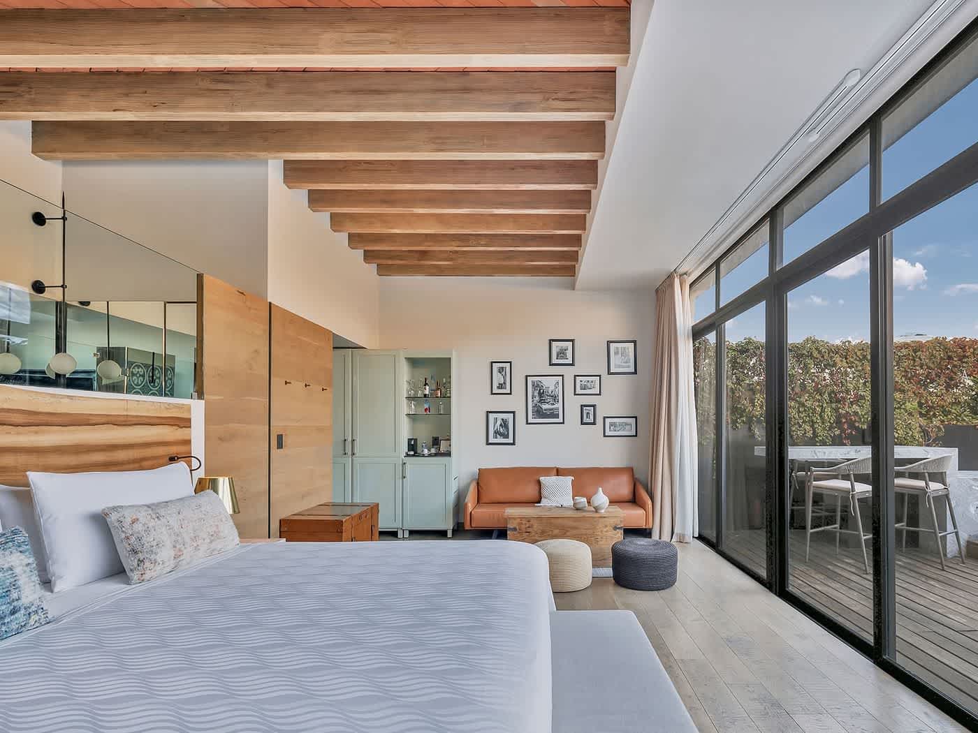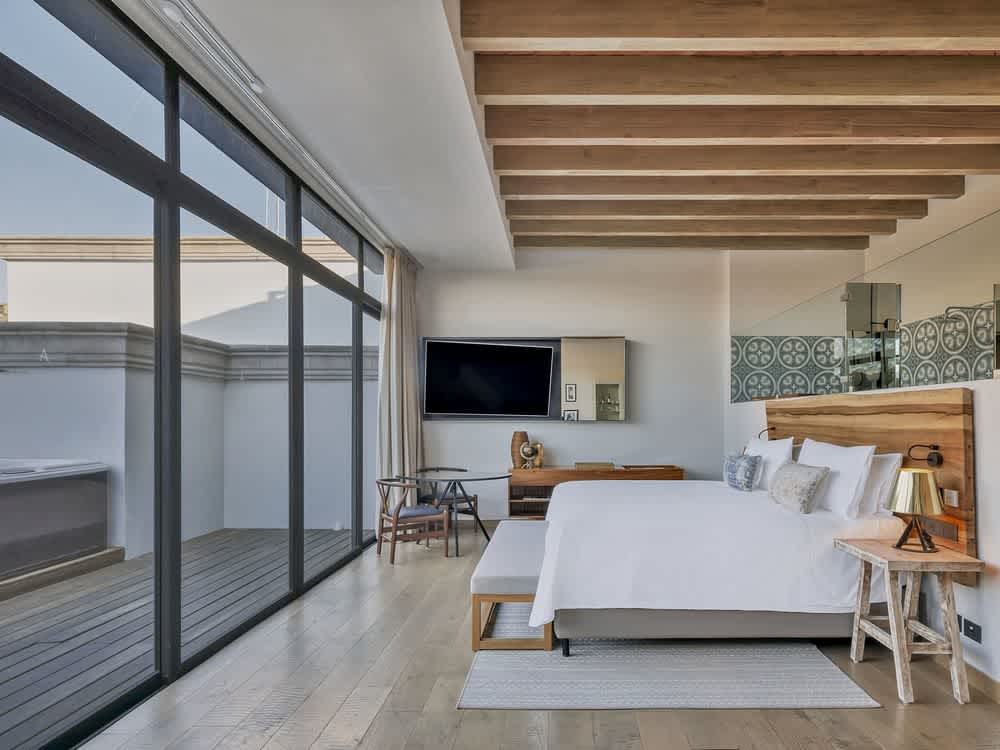 Inspiration, freedom and harmony come together in this sophisticated and comfortable suite. Enjoy the softness of a spacious king-size bed with a feather mattress and 400-thread-count designer sheets. An exclusive fragrance from our reed diffuser will enchant all your senses with pleasure and relaxation. Enjoy the best of entertainment on your 58-inch Smart TV. Pamper yourself with our Molton Brown amenities. In addition, it has a Nespresso coffee machine for your delight. Savor a drink from the bar in your room or while taking in views of the city on your private patio, complete with Jacuzzi and outdoor lounge.