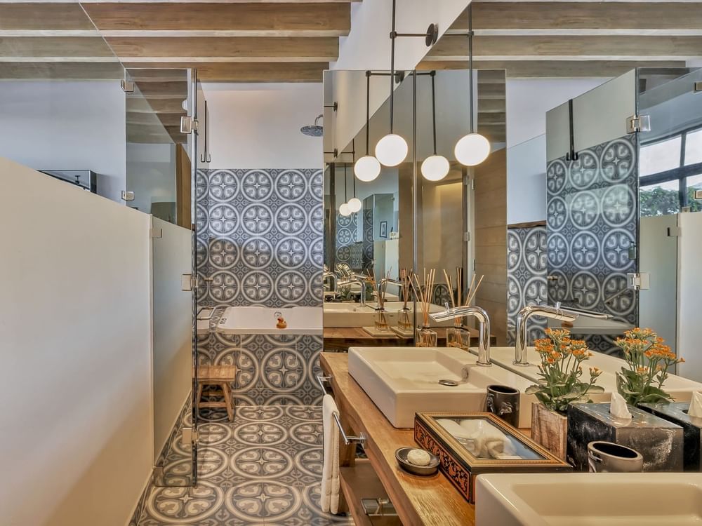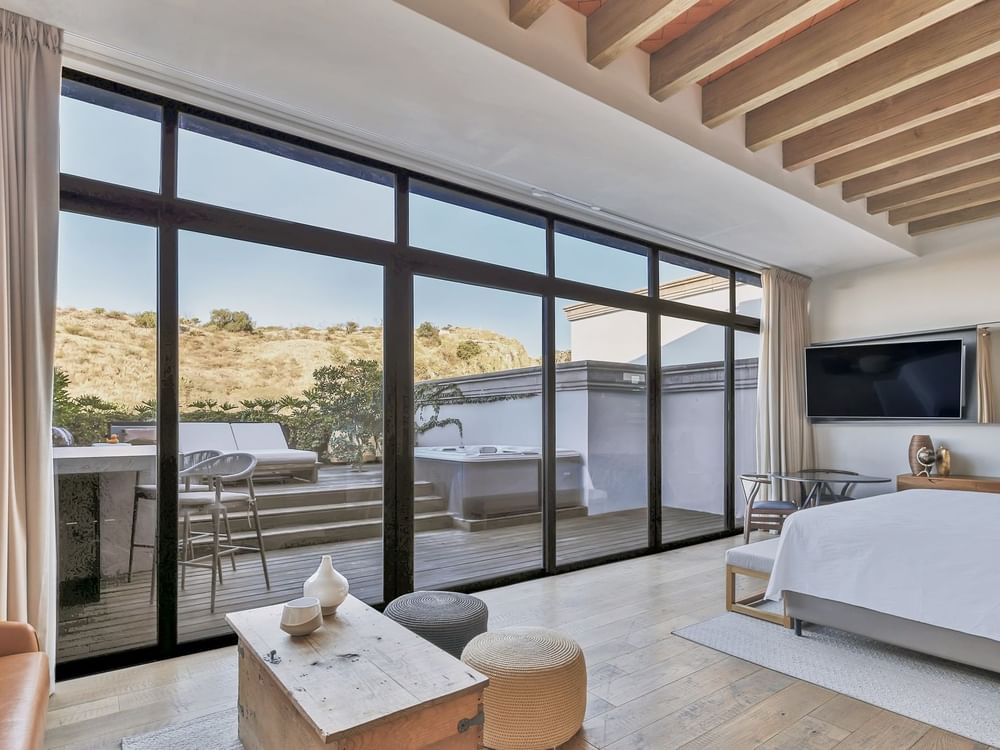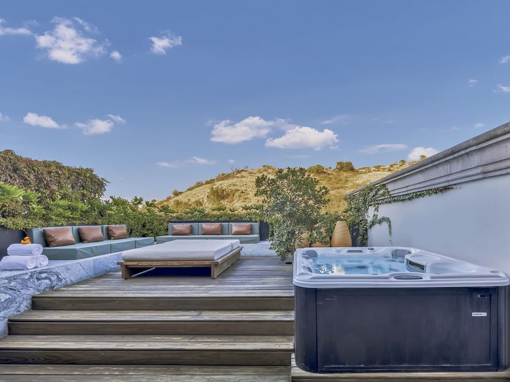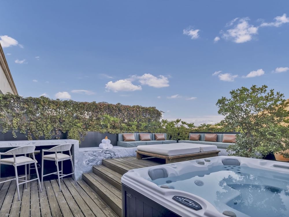 Inspiration, freedom and harmony come together in this sophisticated and comfortable suite. Enjoy the softness of a spacious king-size bed with a feather mattress and 400-thread-count designer sheets. An exclusive fragrance from our reed diffuser will enchant all your senses with pleasure and relaxation. Enjoy the best of entertainment on your 58-inch Smart TV. Pamper yourself with our Molton Brown amenities. In addition, it has a Nespresso coffee machine for your delight. Savor a drink from the bar in your room or while taking in views of the city on your private patio, complete with Jacuzzi and outdoor lounge.
