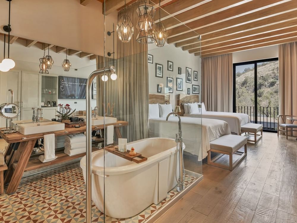 With an ergonomic, elegant and modern design, this space will engage all your senses. The high-tech details integrated into its design ensure that you will have the best moments, no matter the reason for your trip. Feel the softness of a feather bed as you wrap yourself in 400-thread-count sheets. We also provide you with a reed diffuser, a 58-inch Smart TV and a Nespresso coffee machine so you can enjoy delicious coffee in your own room.