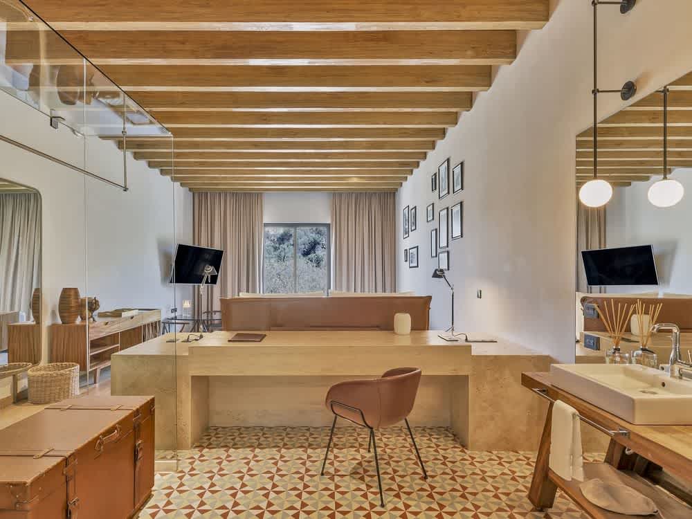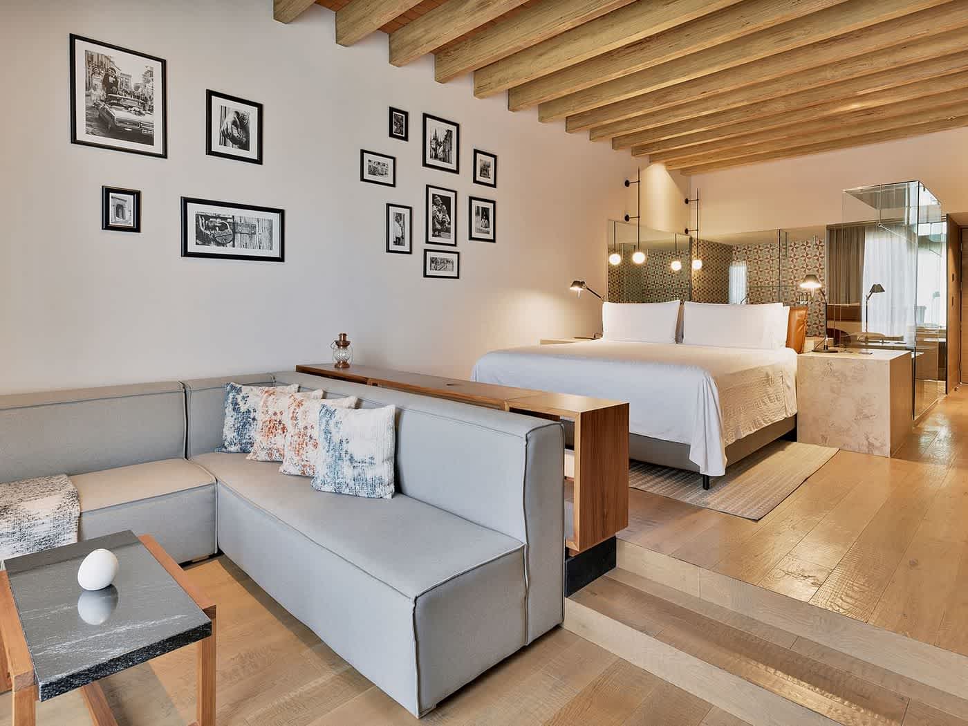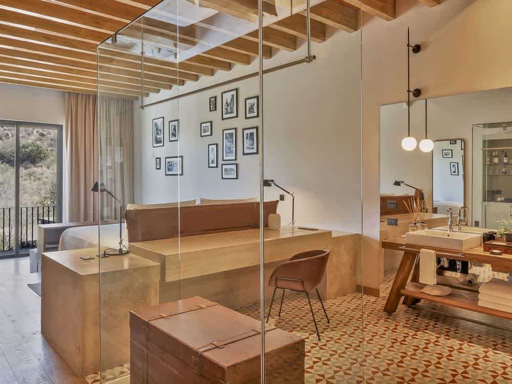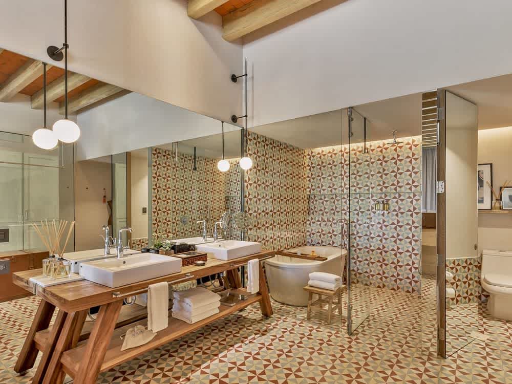 The spaciousness of this suite will impress you from the first moment. Pamper your senses in a quiet environment that offers privileged lighting, thanks to its large windows. You will even get to enjoy the aroma of the wood from the ceiling beams. It is a classic Mexican style, a comforting setting that will put you in the right mood for a drink in your private bar. Relax and soak in the tub with our Live Aqua rubber ducky and enjoy our exclusive reed diffuser. Enjoy the best of entertainment on your 58-inch Smart TV. Pamper yourself with our Molton Brown amenities. In addition, this room has a Nespresso coffee machine for your convenience.