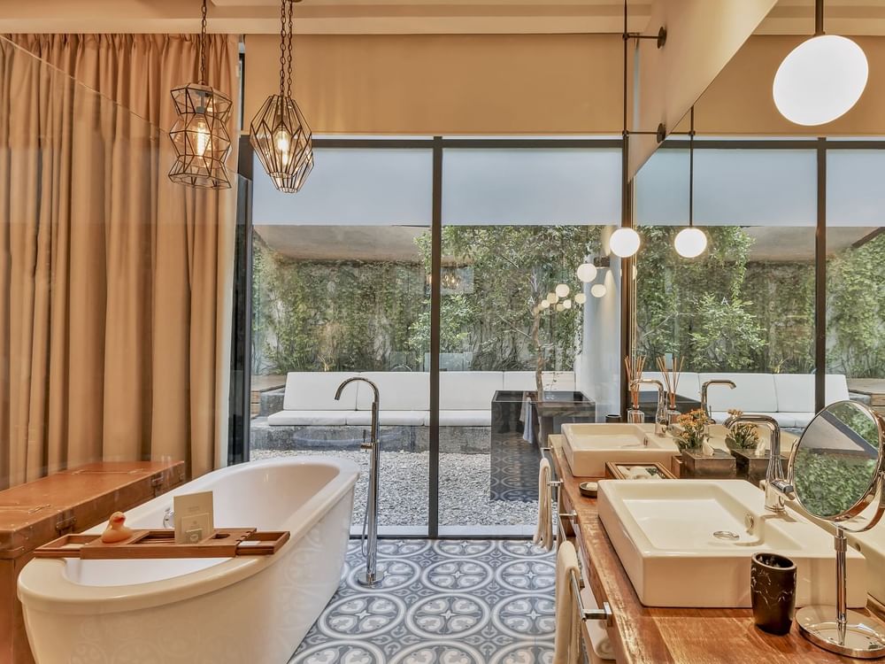 Focus on your own rest as tranquility is ensured in this room. Ergonomic spaces with a contemporary and sophisticated design will make you feel in a relaxed space. Create your own environment with an essence from our reed diffuser. Wrap yourself in the soft bed with a feather mattress and 400 thread count sheets. The bathroom offers views of the room and has a separate tub from the shower. There is also an outdoor stay next to the plunge pool. Enjoy the best of entertainment on your 58-inch Smart TV. Pamper yourself with our Molton Brown amenities. In addition, this room has a Nespresso coffee machine for your convenience.